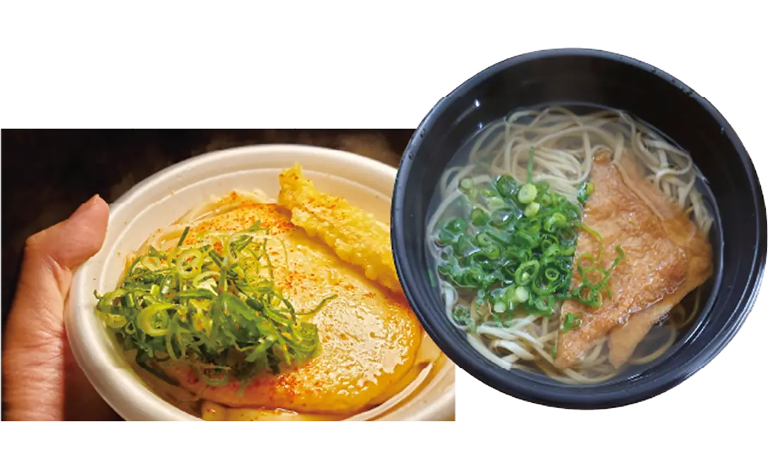 Items sold: Udon noodles, soba noodles, zenzai (sweet red bean soup), and Hakata-ori textiles.